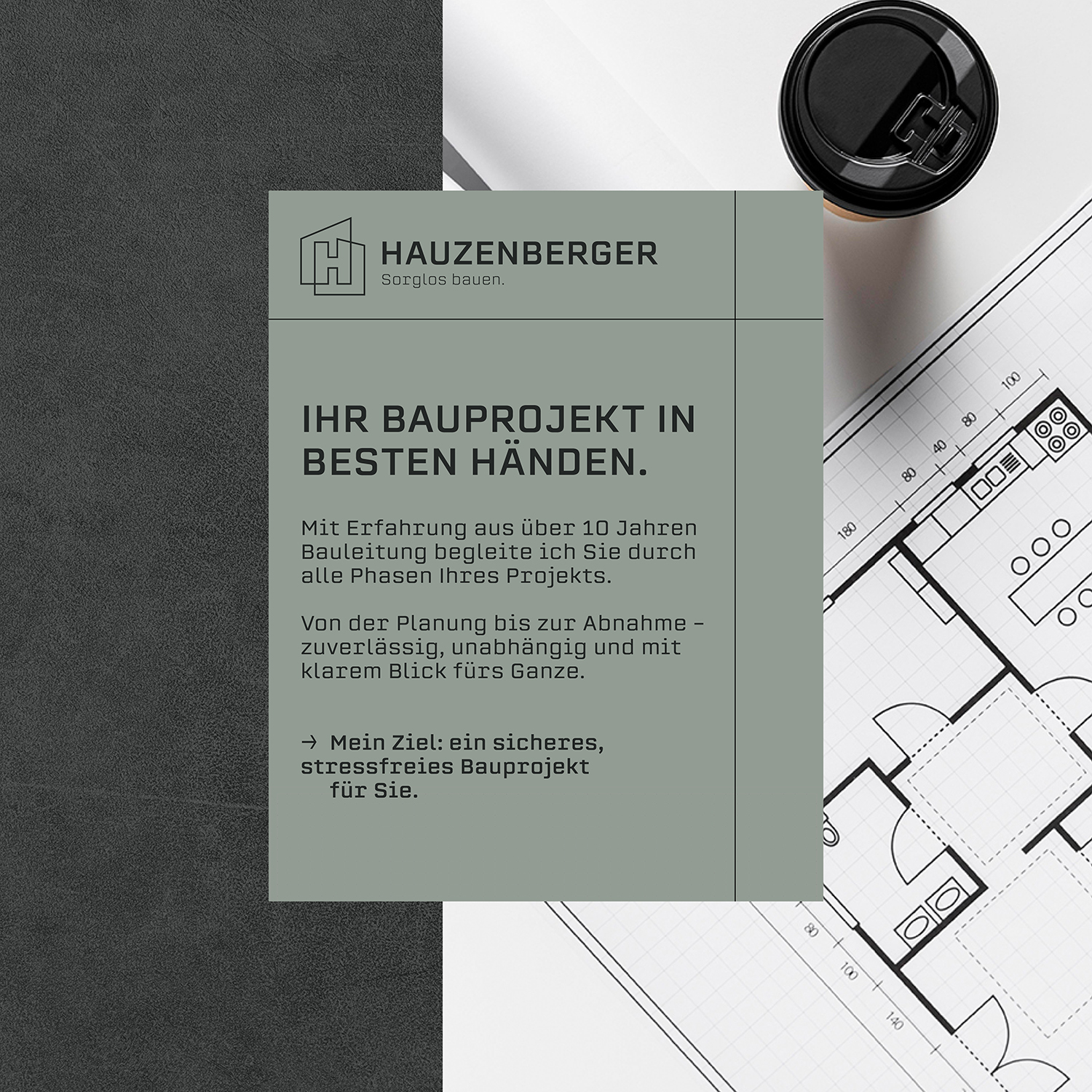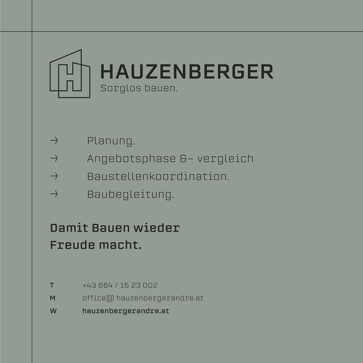 Für André Hauzenberger durften wir den gesamten Markenauftritt von Grund auf entwickeln. Ziel war es, seine umfassende Expertise rund um Planung, Angebotsphase, Baustellenkoordination und Baubegleitung klar zu strukturieren und nach außen sichtbar zu machen – seriös, modern und vertrauenswürdig.